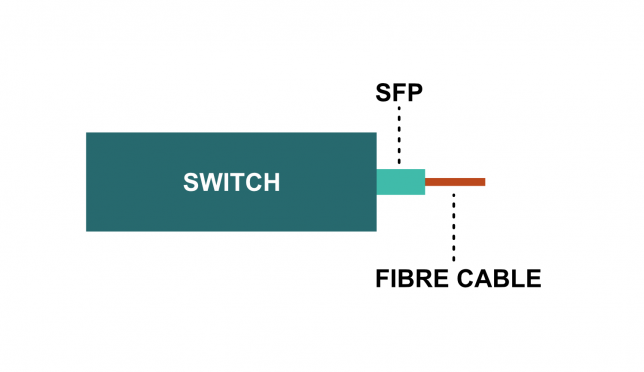 SFP stands for Small Form-Factor Pluggable. A Switch which accepts SFPs will have an empty slot for you to add an SFP into. Once plugged in, we will have an interface on that Switch which we can plug our Fibre Cable directly into.
