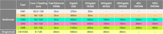 - Within Multi-Mode Fibre, standards of cabling have been increasing to be able to carry higher bandwidth across longer distances